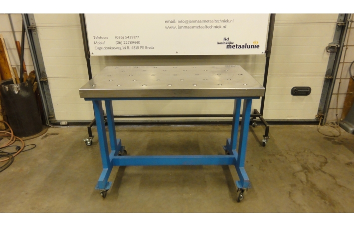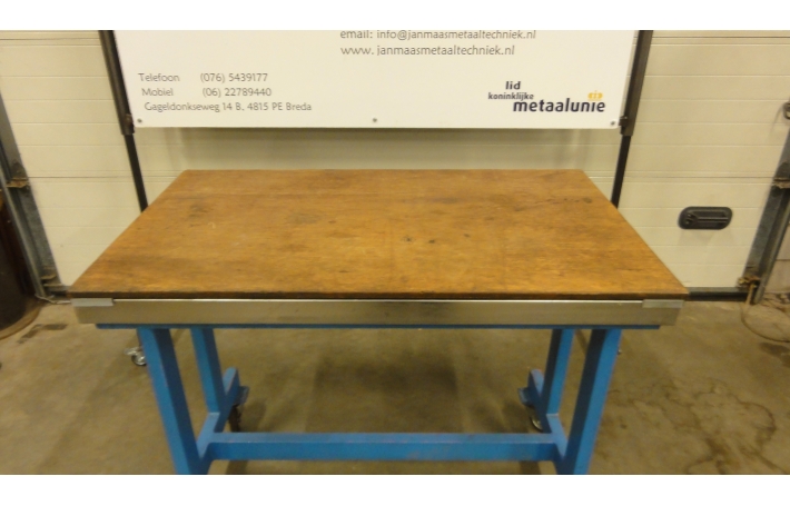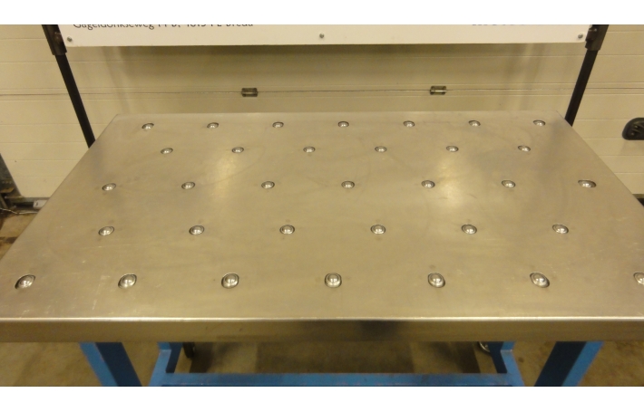 Rolkogel montagetafelOmschrijving: Rolkogel montage en transport tafelArtikelnummer: 00056 Merk: NB Type: Werktafel met rolkogellagers Capaciteit: 300 kg Afmeting: 1200x 700x 950mm Conditie: Gebruikt Opmerking: De tafel is voorzien van 4 zwenkwielen, kan gebruikt worden als montage- en als transportafel. de tafel vergemakkelijkt de montage, wanneer het product veel verschoven- en of gedraaid moet worden. Tevens is er een houten (werk- beschermblad) afdekblad bij. Prijs: Op aanvraag |