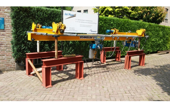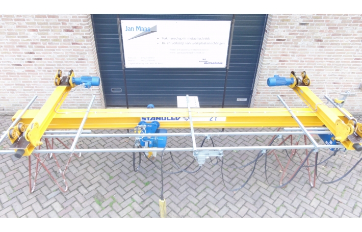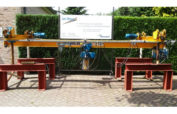 Artikelnummer: 00058 Merk: Abus Type: DLVM (380volt) Capaciteit: 2000 Kg. Hijshoogte 2,9 meter (eenvoudig aan te passen tot max. 9 meter. Afmeting: 5x 2x 1M. Conditie: Gebruikt Opmerking: Abus hangloopkranen bieden een optimale oplossing waar normale bovenloopkranen door de constructie van het gebouw minder geschikt zijn. Het belangrijkste kenmerk is dat de kraanbaan niet is bevestigd aan kolommen, maar aan de spanten van het gebouw. Uiteraard is een constructie met kolommen ook mogelijk. De gehele kraan is samengebouwd en voorzien van kabelrails en afstandsbediening. De kraan heeft 2 snelheden en eindschakelaar in alle richtingen. De bovenloop / onderhangkraan is werkend te zien. Prijs: Verkocht
